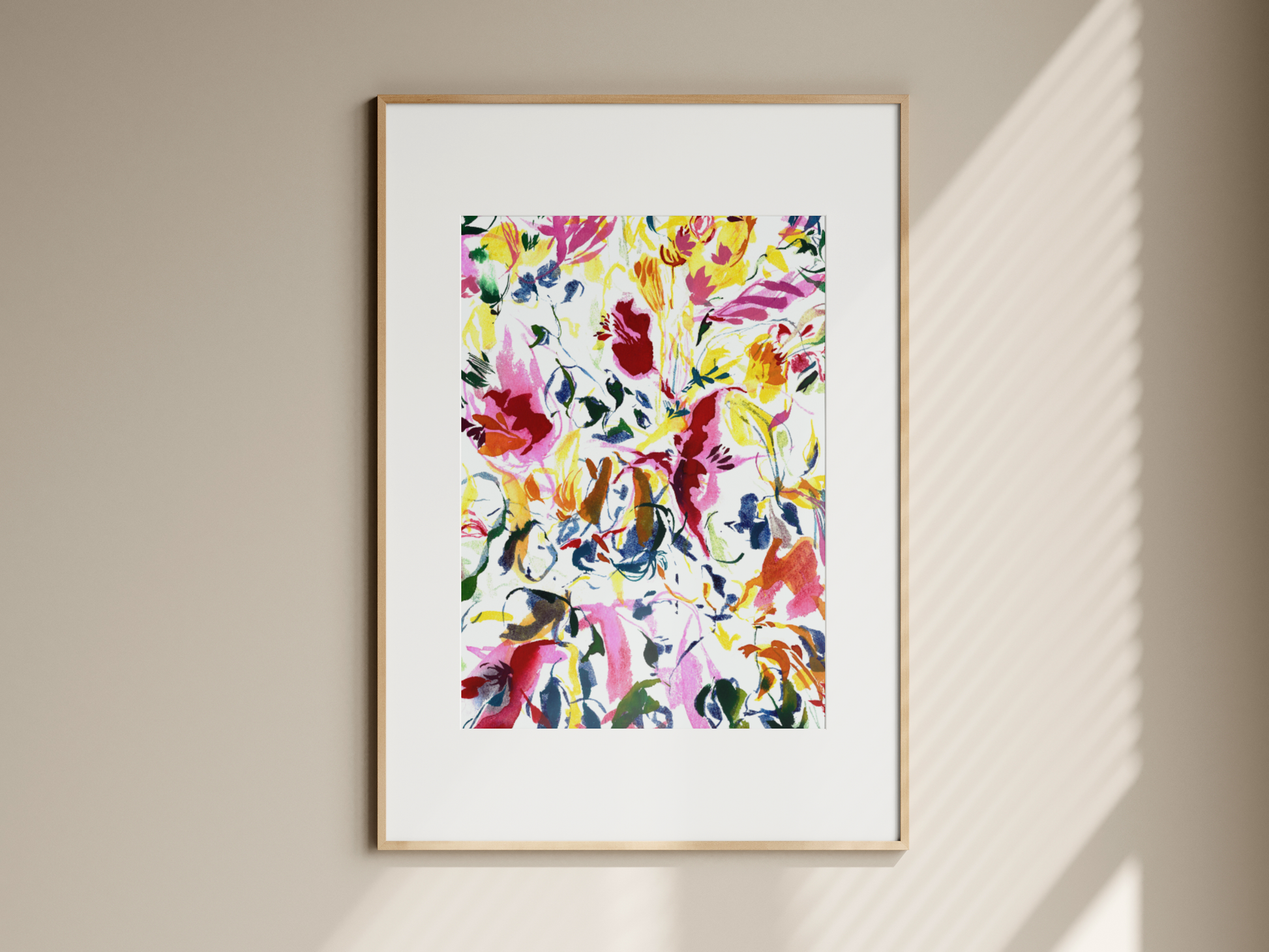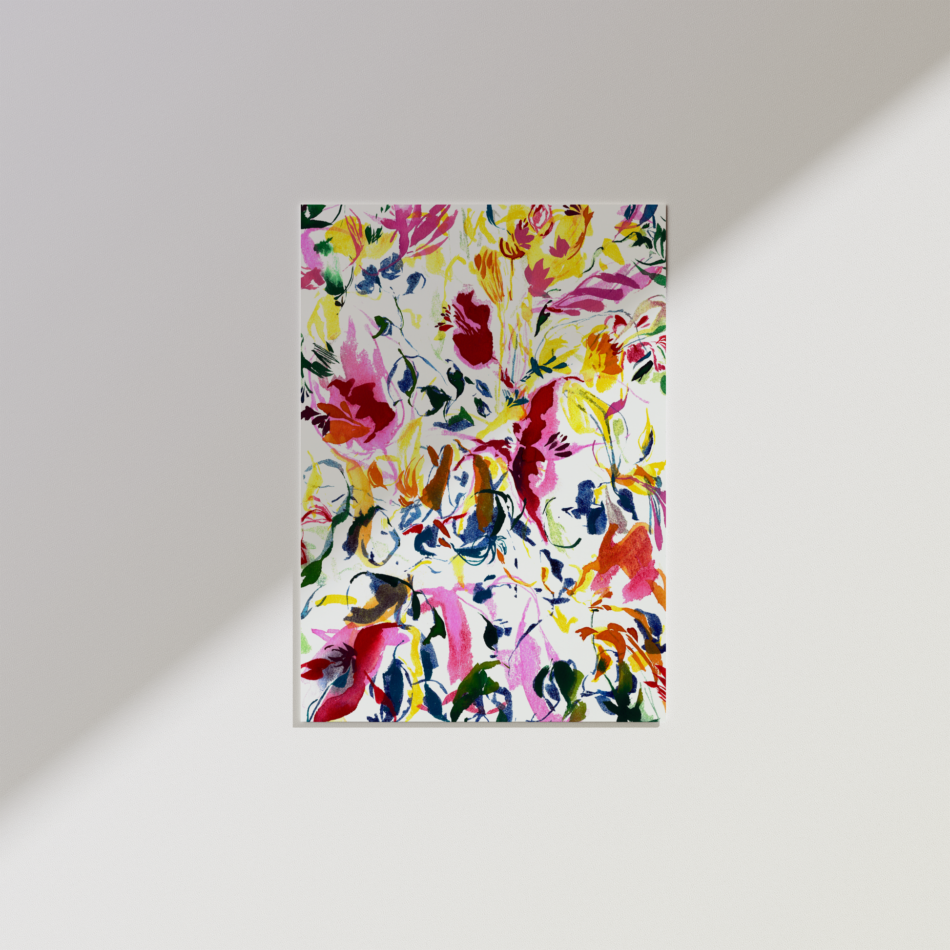 This abstract watercolor art print represents nature and flowers. Its color and vibrancy are inspired by happy memories in the countryside with friends and family.